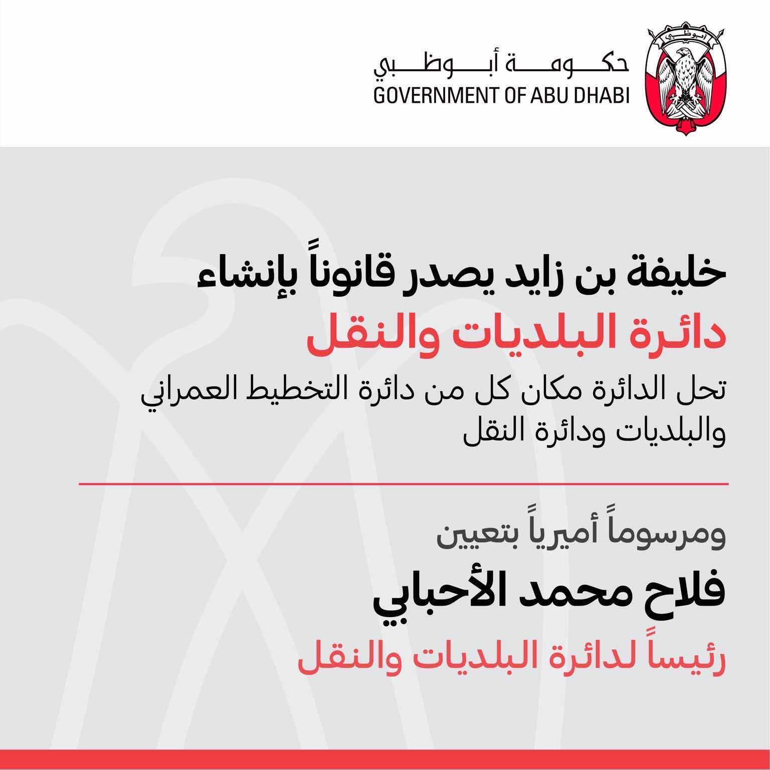 Uzivatel مكتب أبوظبي الإعلامي Na Twitteru خليفة بن زايد يصدر بصفته حاكما لإمارة أبوظبي قانونا بإنشاء دائرة البلديات والنقل على أن تحل مكان كل من دائرة التخطيط العمراني والبلديات ودائرة النقل وتكون