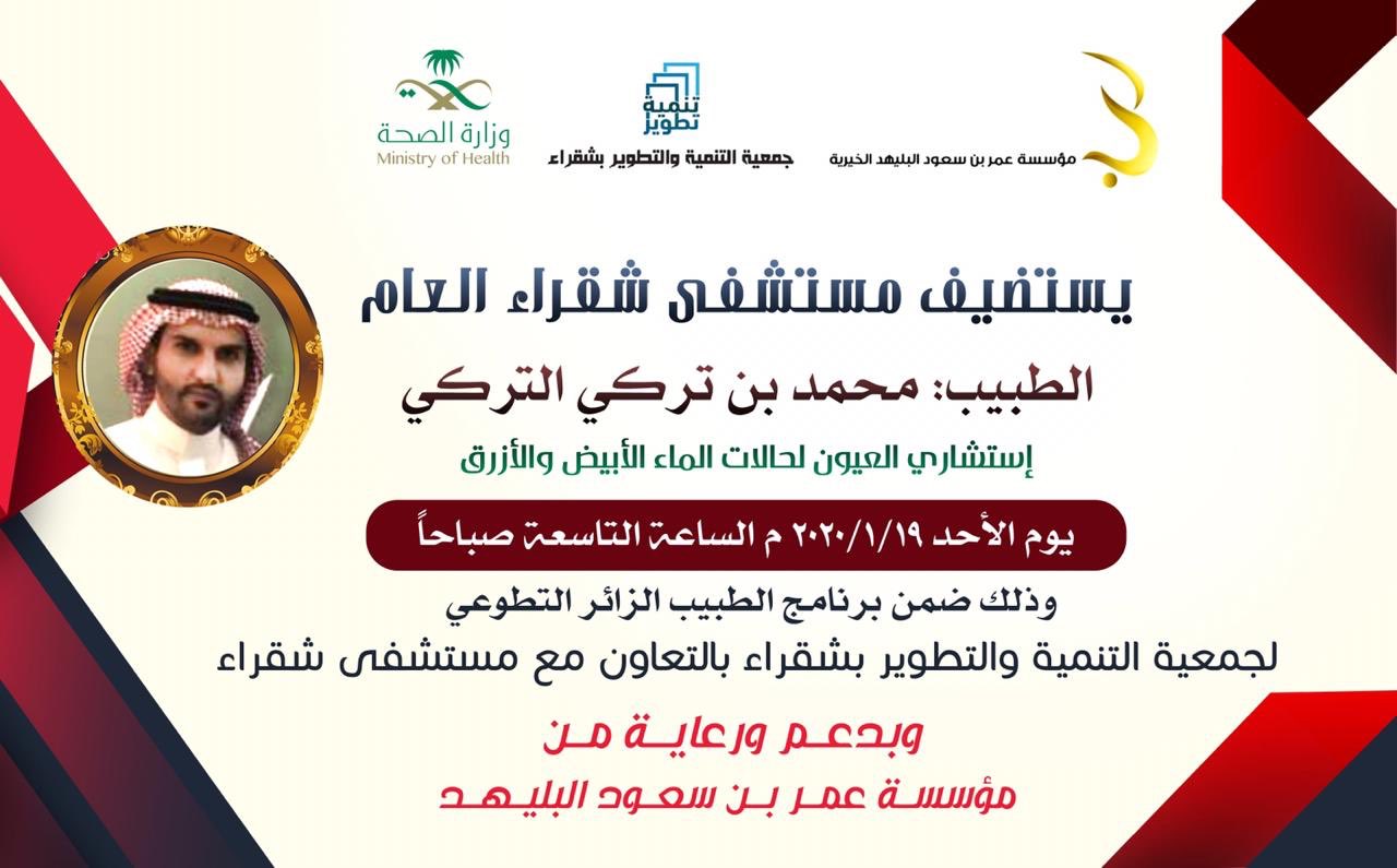 صحيفة شقراء نت V Twitter يستضيف مستشفى شقراء العام الطبيب محمد بن تركي التركي استشاري العيون لحالات الماء الابيض والازرق يوم الاحد ٢٠٢٠ ١ ١٩ التاسعة صباحا وذلك ضمن برنامج الطبيب الزائر التطوعي
