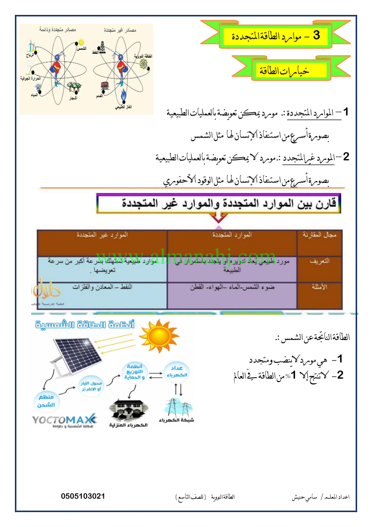 ملزمة علوم موارد الطاقة المتجددة الصف التاسع علوم الفصل الثالث 2017 2018 المناهج الإماراتية