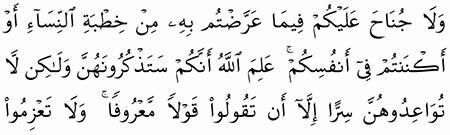 و ل ا ج ن اح ع ل ي ك م ف يم ا ع ر ض ت م ب ه م ن خ ط ب ة الن س اء أ و أ ك ن ن ت م ف ي أ ن ف س ك م ع ل م الل ه أ ن ك م س ت ذ ك ر ون ه ن و ل ك ن ل ا ت و اع د وه ن س ر ا إ ل ا أ ن ت ق ول وا ق و ل ا م ع ر وف ا و ل ا ت ع ز م وا