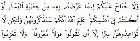 و ل ا ج ن اح ع ل ي ك م ف يم ا ع ر ض ت م ب ه م ن خ ط ب ة الن س اء أ و أ ك ن ن ت م ف ي أ ن ف س ك م ع ل م الل ه أ ن ك م س ت ذ ك ر ون ه ن و ل ك ن ل ا ت و اع د وه ن س ر ا إ ل ا أ ن ت ق ول وا ق و ل ا م ع ر وف ا و ل ا ت ع ز م وا