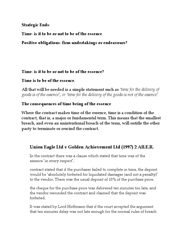 Strategic Ends Time Is It To Be Or Not To Be Of The Essence Positive Obligations Firm Undertakings Or Endeavours Indemnity Breach Of Contract